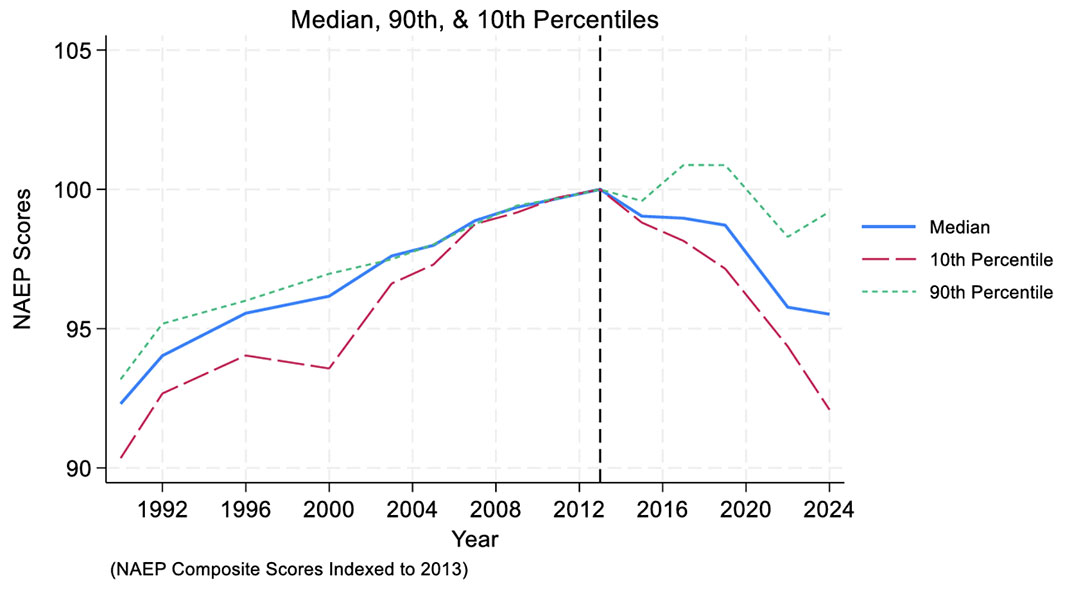 Much of what appears to be “pandemic learning loss” (declines after 2020) was part of a longer-term downward trajectory in student performance that began years earlier.