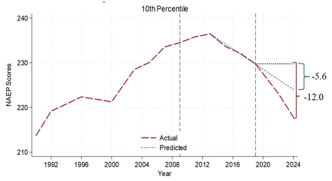 - The researcher used NAEP 8th grade math scores for students at the 10th percentile and projected forward the trajectory from 2013–2019 (the years before COVID) to estimate what scores would have been in 2024 if those trends had simply continued. That projection predicted a decline of 5.6 scale score points by 2024. However, the actual decline was 12.0 points. Because 5.6 is roughly 47 percent of 12.0, the researcher inferred that nearly half of the total decline observed after 2019 had already been underway before the pandemic.